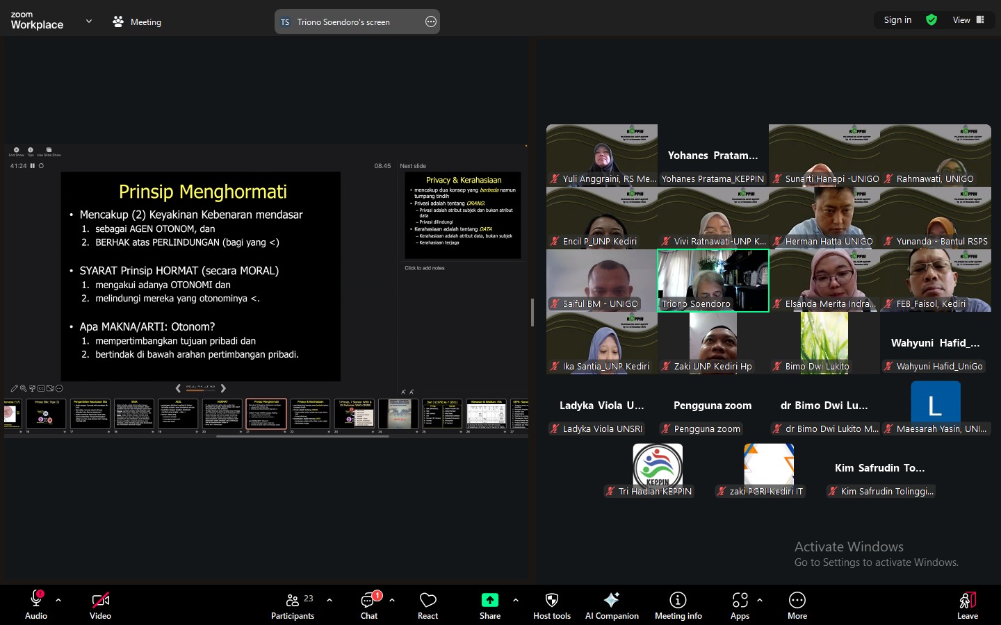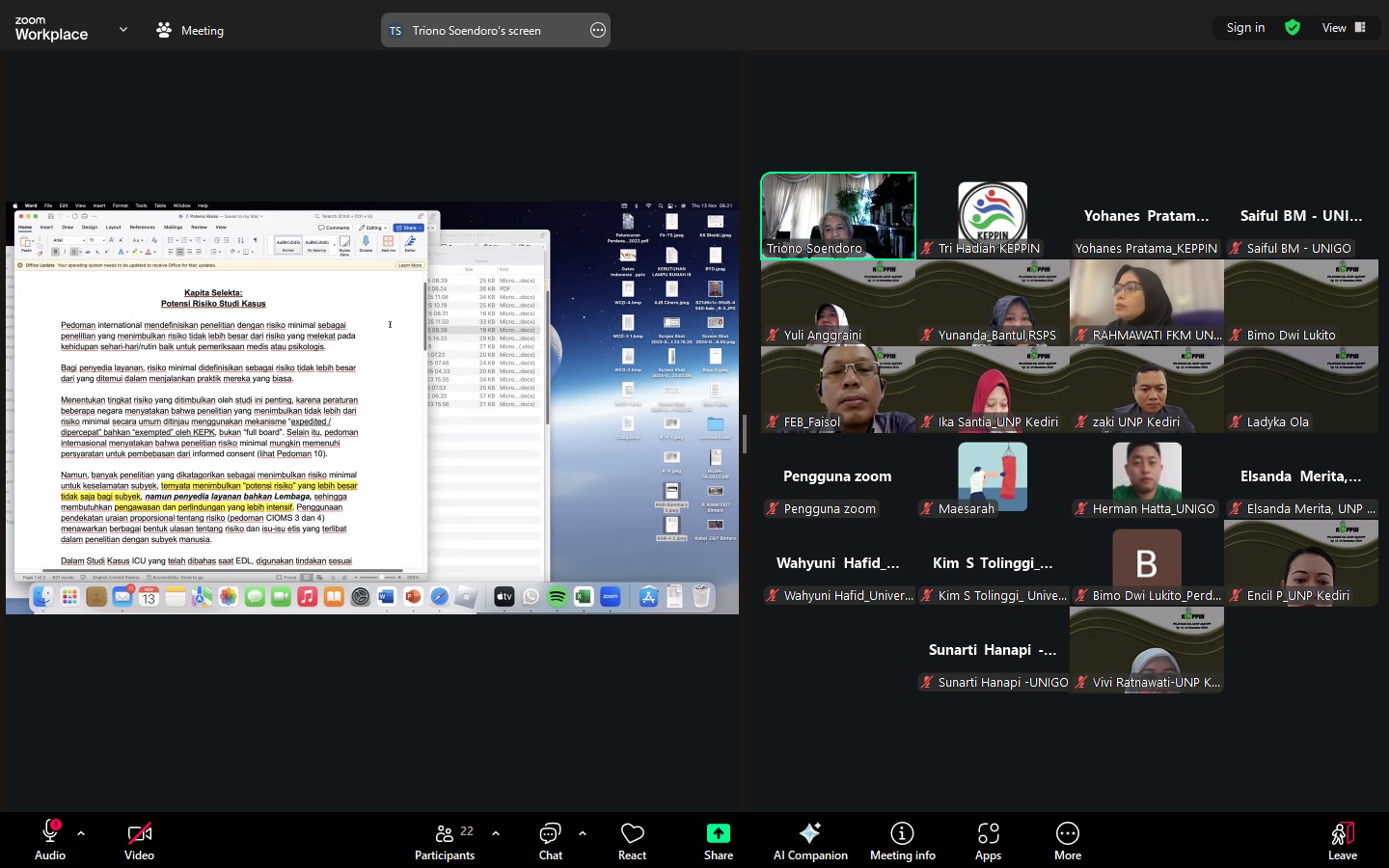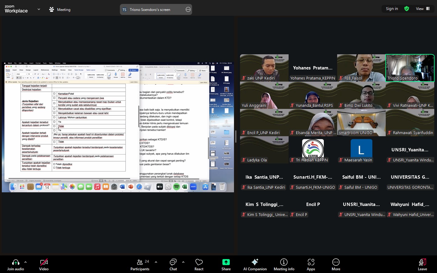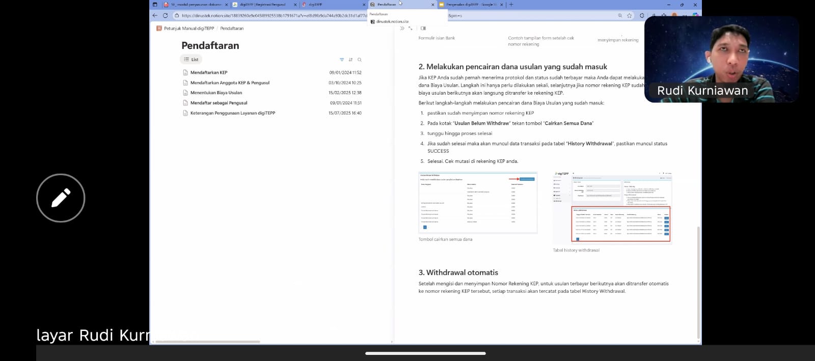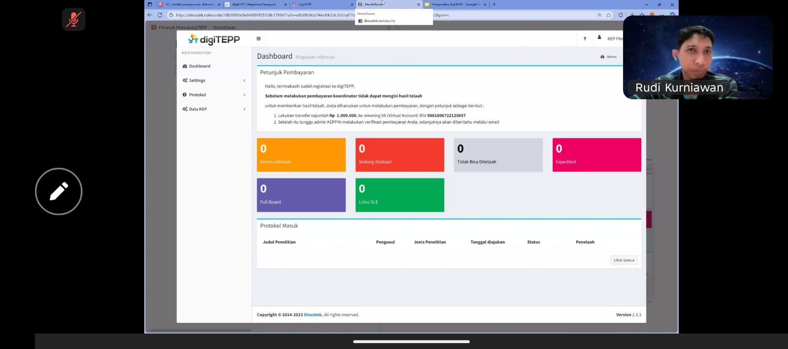 Pada hari kedua sesi malam, dilakukan proses pendaftaran Komite Etik Penelitian (KEP) ke dalam aplikasi DigiTEPP untuk Universitas Gorontalo dan Universitas Nusantara PGRI Kediri. Kegiatan ini dipandu langsung oleh Pak Rudi, selaku tim pengembang DigiTEPP.