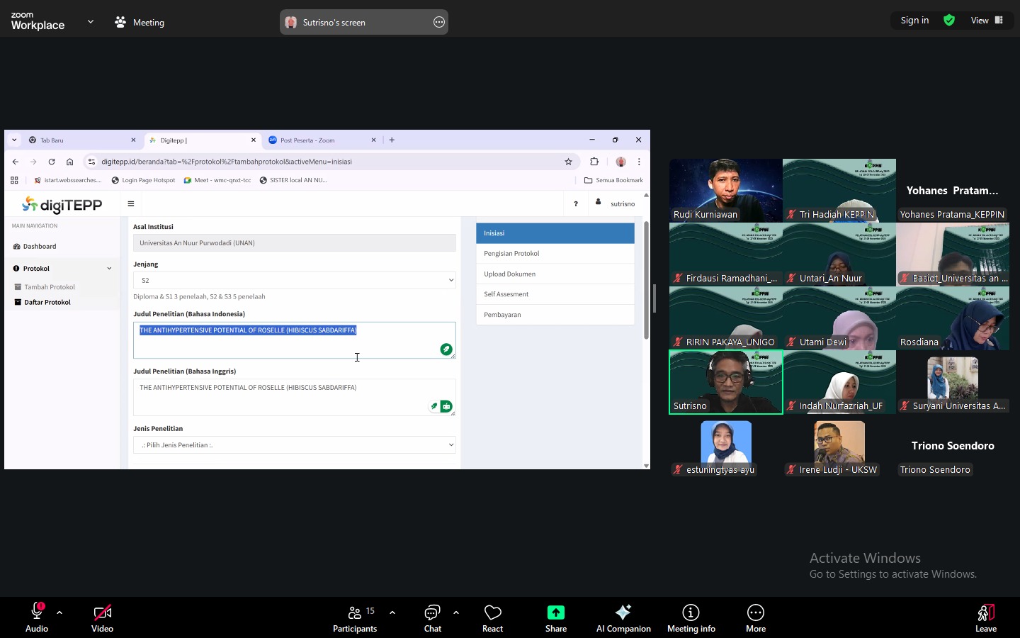 Pada hari pertama sesi malam, dilakukan pendaftaran Komite Etik Penelitian (KEP) ke dalam aplikasi DigiTEPP dari Universitas An Nuur Purwodadi, yang dipandu oleh Pak Rudi, selaku tim pengembang DigiTEPP.