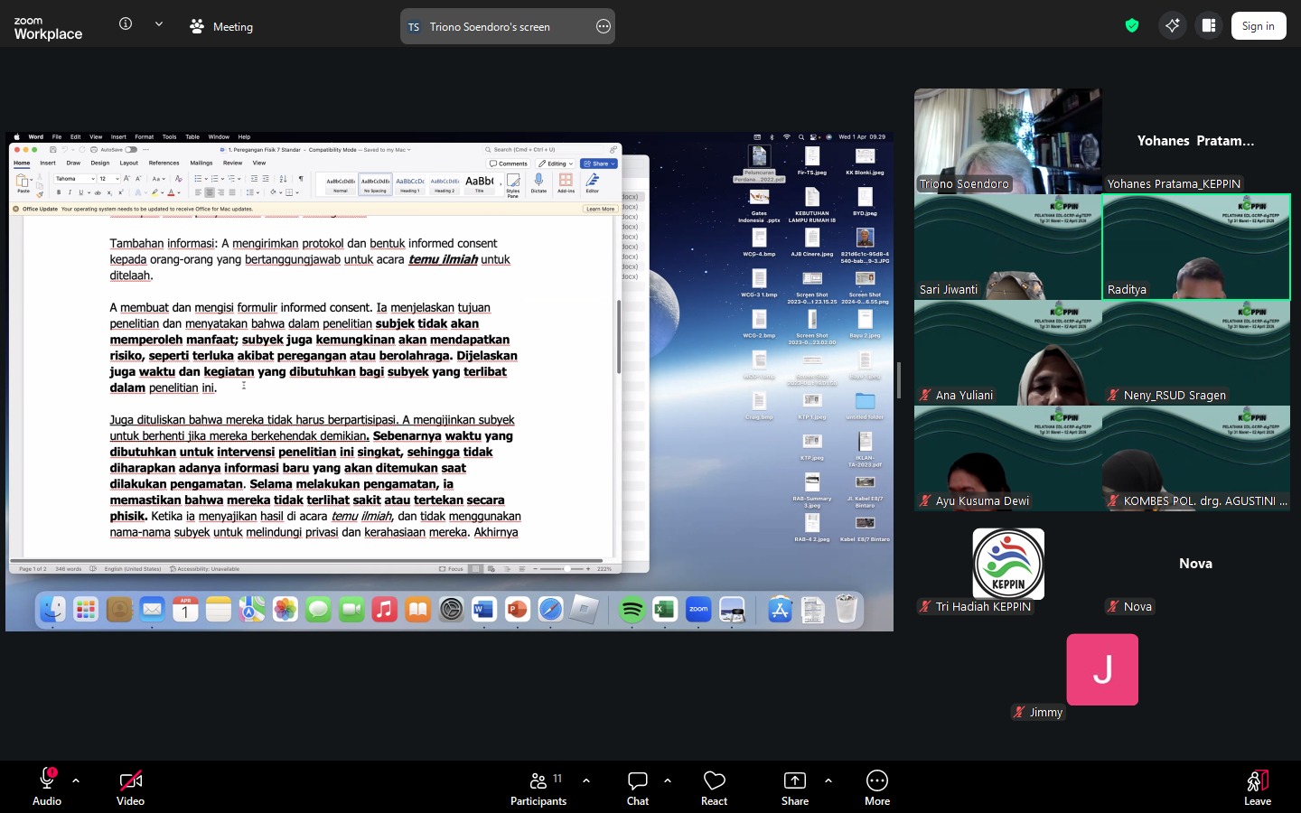 Selanjutnya, pada hari ketiga, pelatihan dilanjutkan dengan sesi pendalaman materi yang kembali dibawakan oleh Dr. Triono Soendoro, guna memperkuat pemahaman peserta dalam implementasi etik penelitian secara komprehensif.