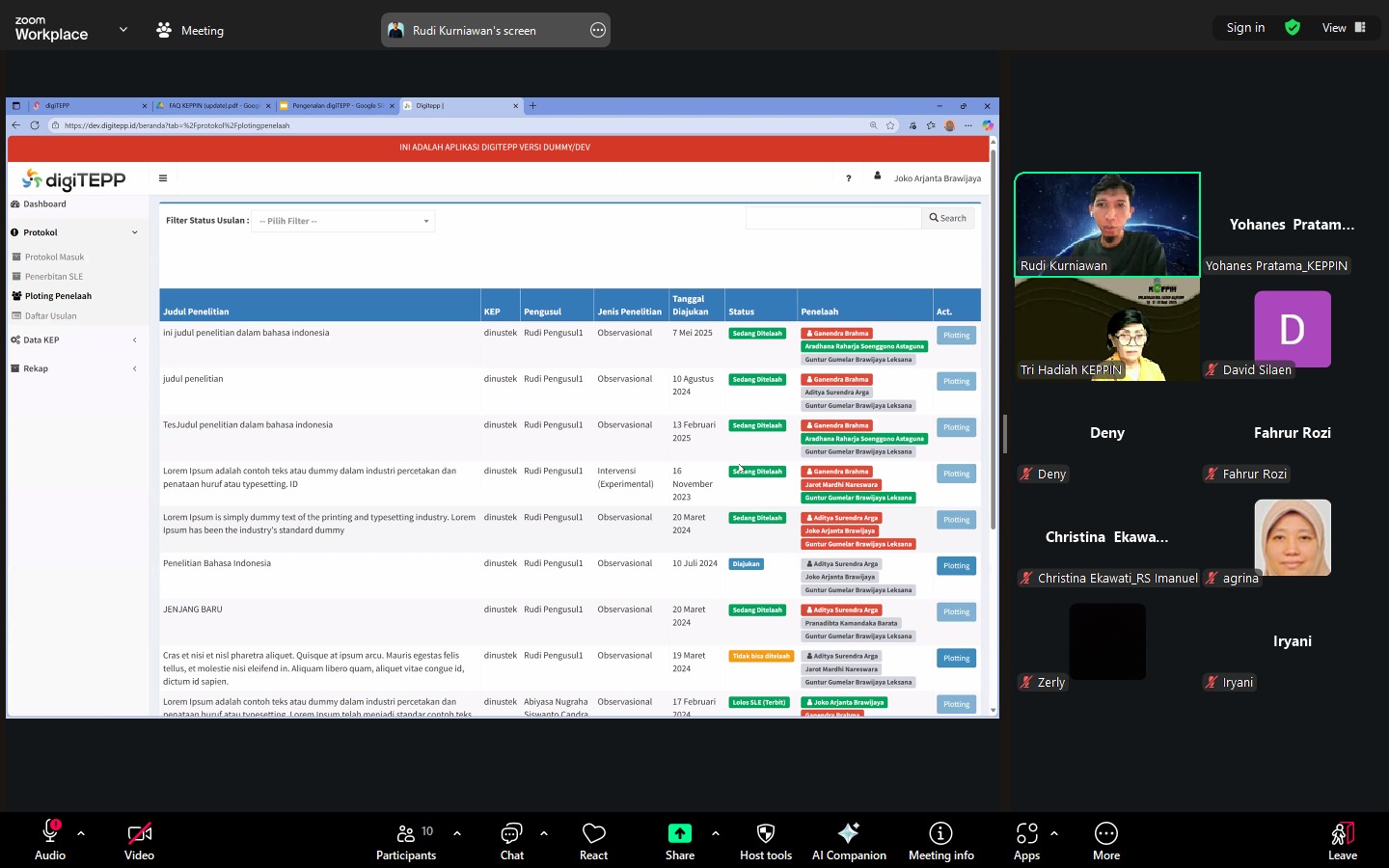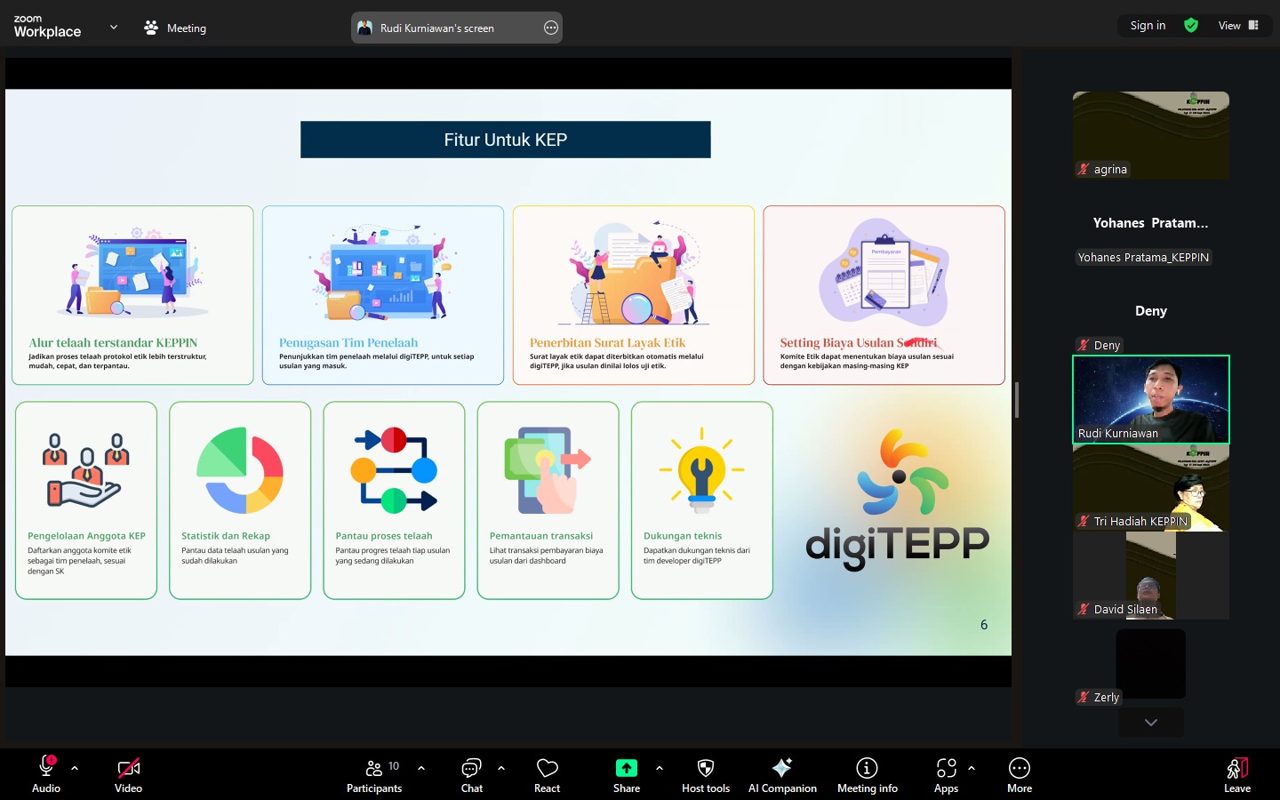 Pada hari ketiga, sesi siang difokuskan pada pengenalan DigiTEPP (Digitalisasi Telaah Etik Protokol Penelitian). Fitur dan fungsi aplikasi ini dipaparkan langsung oleh Pak Rudi dari DinusTek, tim pengembang yang bertanggung jawab atas sistem tersebut. Seluruh peserta mengikuti sesi ini dengan antusias sebagai bekal dalam mendukung efisiensi dan transparansi telaah etik penelitian.